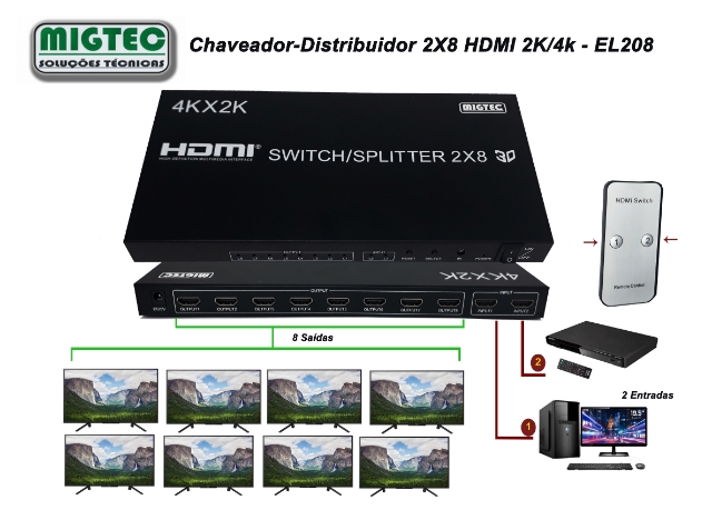 Chaveador-Distribuidor 2X8 HDMI 2K/4k – EL208