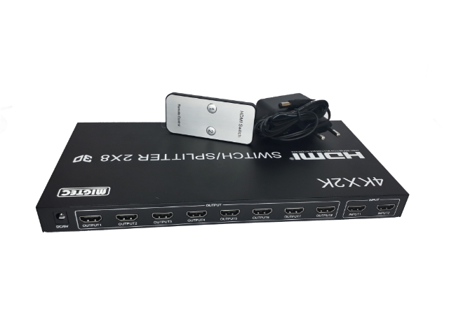 Hardware para distribuição de sinal digital. O produto possui duas entradas de sinal, para conectar aparelhos diferentes: desktop, laptop, DVD player, home theater, blu-ray, receptor de satélite, decodificador e outros.Cada dispositivo conectado em uma entrada (IN1 e IN2) libera o sinal para oito dispositivos compatíveis com o padrão HDMI: monitor LCD, TV digital. TV tablet, TV de alta definição (HDTV), projetor digital, receptor de vídeo e áudio e outros.