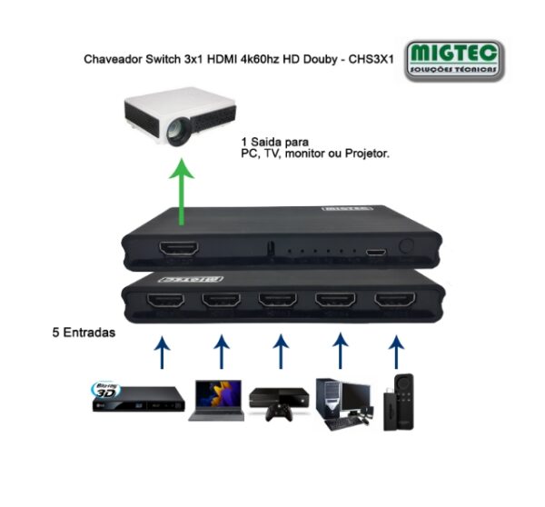 Compartilhe a sua TV entre equipamentos facilmente com o chaveador, adaptador Switch 5×1 HDMI 4k60hz HD Douby.